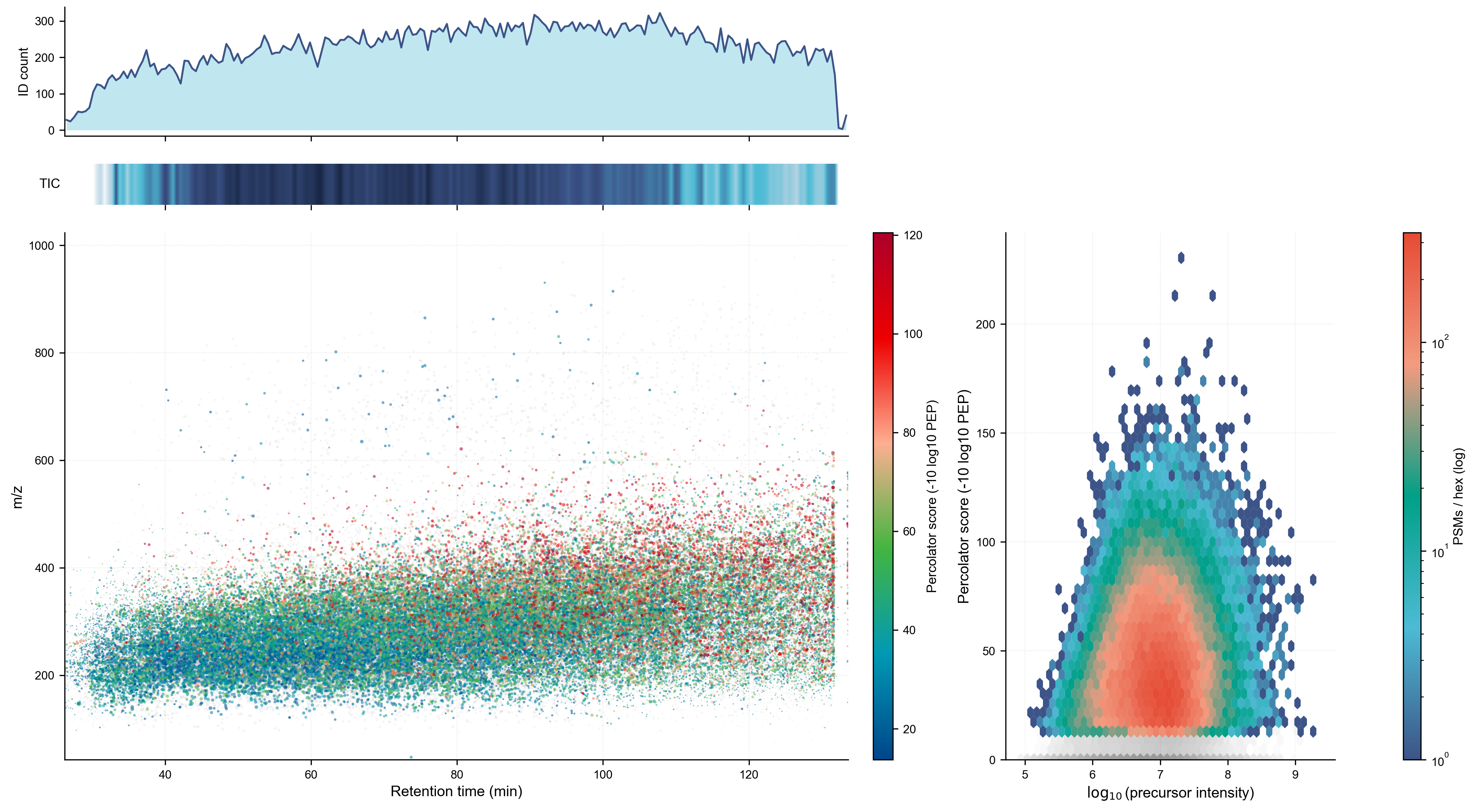 Left Bottom: RT vs. m/z scatter with points colored by Percolator score (blue→green→red colormap). The gray points are unidentified scans and not east to see as the identified ones are plotted over them and the identification rate is ~50%.