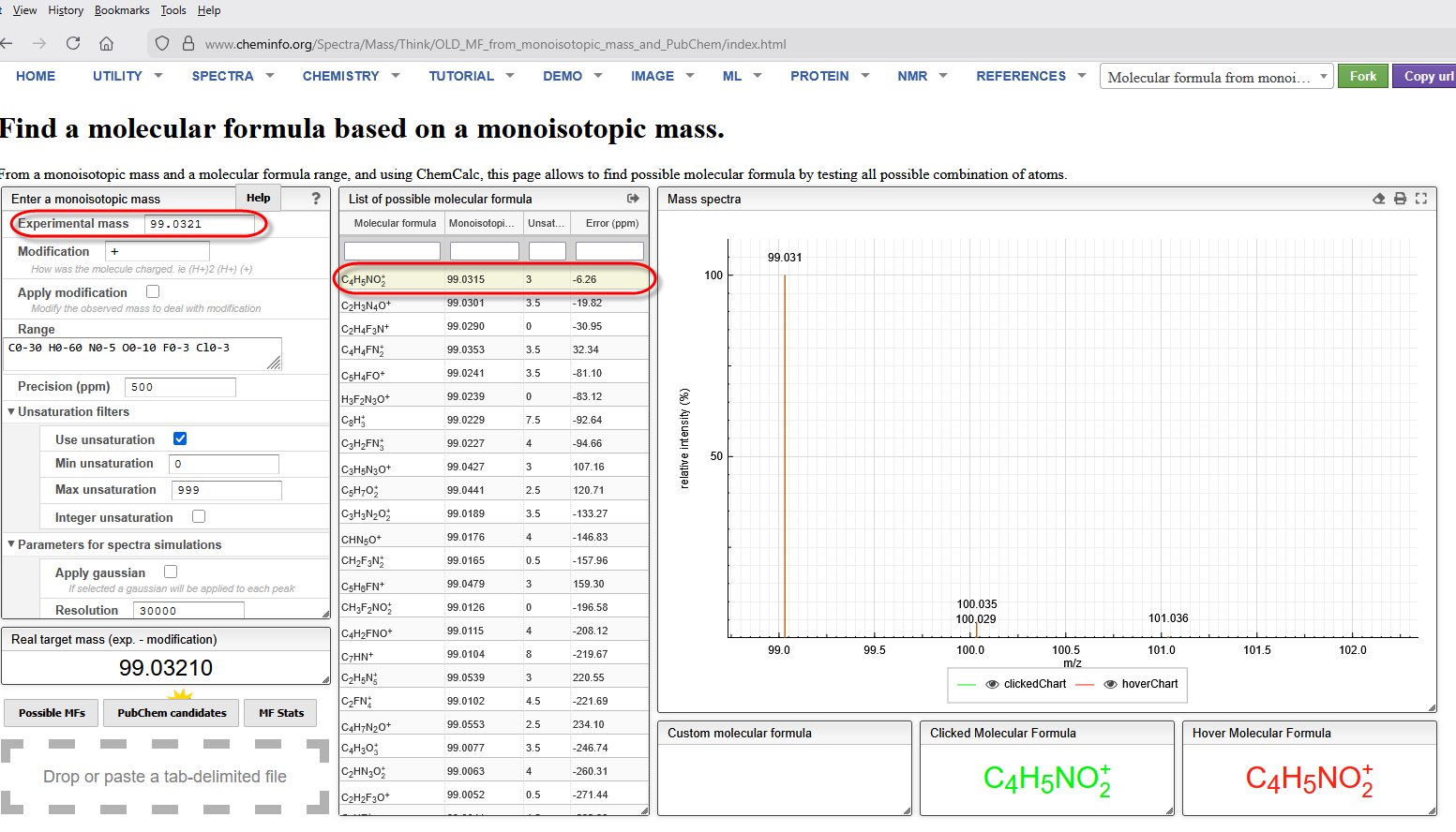 We may not know what these masses are, but we need to add them to Mascot Server to bring the SL on line. The first two we can figure from the masses 286.1844 on Cys is equivalent to TMT6plex + Carbamidomethyl, while 458.3259 on Lys is TMT6plex on the N-term and side chain. You’ll need a likely molecular composition for the mass and add them as a custom modification to our Mascot Server. For the unknown 99.0321 on Cys We used the ChemCalc tool at Cheminfo.org to create a list of candidate chemical compositions and then selected the nearest one by mass error.