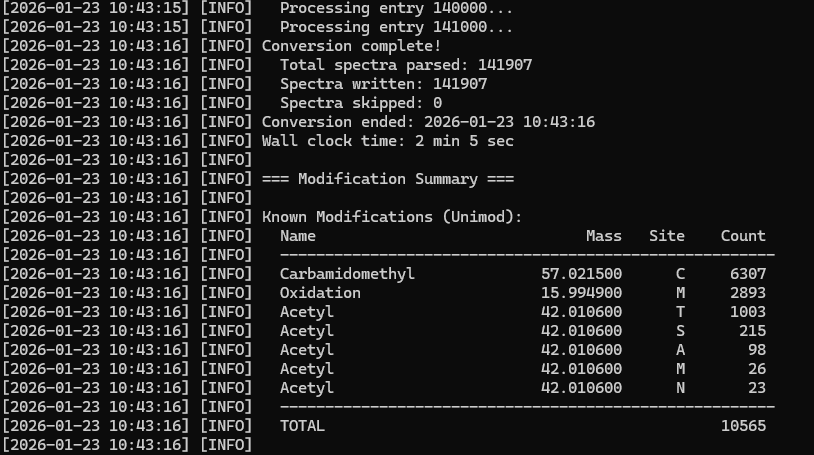 The BLIB to MSP Spectral Library Converter is written in Perl and uses the Mascot Parser library. On Windows, we recommend Strawberry Perl 5.32.1.1; on Linux, Perl is typically installed from your Linux distribution’s repository. Mascot Parser provide routines for handling modifications with Unimod and reading MSP files. The Mascot Parser licensing allows a developer to distribute code and applications that use the library as long as they do not charge any license fee for the application. Commercial licenses are also available.