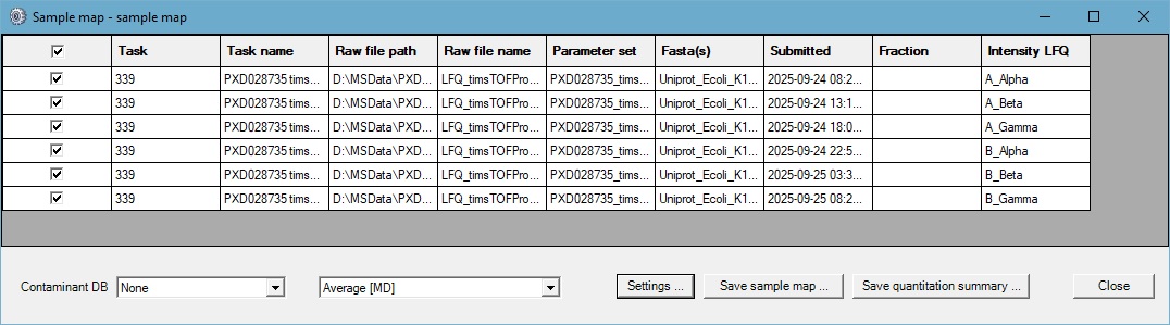Peak-picking, searching and quantification using the “Average” label free quantitation method were automated using Mascot Daemon to process the tdf raw files for the Alpha, Beta and Gamma replicates of the first batch of Sample A and Sample B files from the PRIDE repository, comprising of 6 files in total.